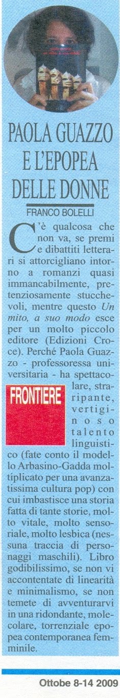 C’è qualcosa che non va, se premi e dibattiti letterari si attorcigliano intorno a romanzi quasi immancabilmente, pretenziosamente stucchevoli, mentre questo Un mito, a suo modo esce per un molto piccolo editore (Edizioni Croce). Perché Paola Guazzo ha spettacolare, straripante, vertiginoso talento linguistico (fate conto il modello Arbasino-Gadda moltiplicato per una avanzatissima cultura pop) con cui imbastisce una storia fatta di tante storie, molto vitale, molto sensoriale, molto lesbica (nessuna traccia di personaggi maschili). Libro godibilissimo, se non vi accontentate di linearità e minimalismo, se non temete di avventurarvi in una ridondante, molecolare, torrenziale epopea contemporanea femminile.